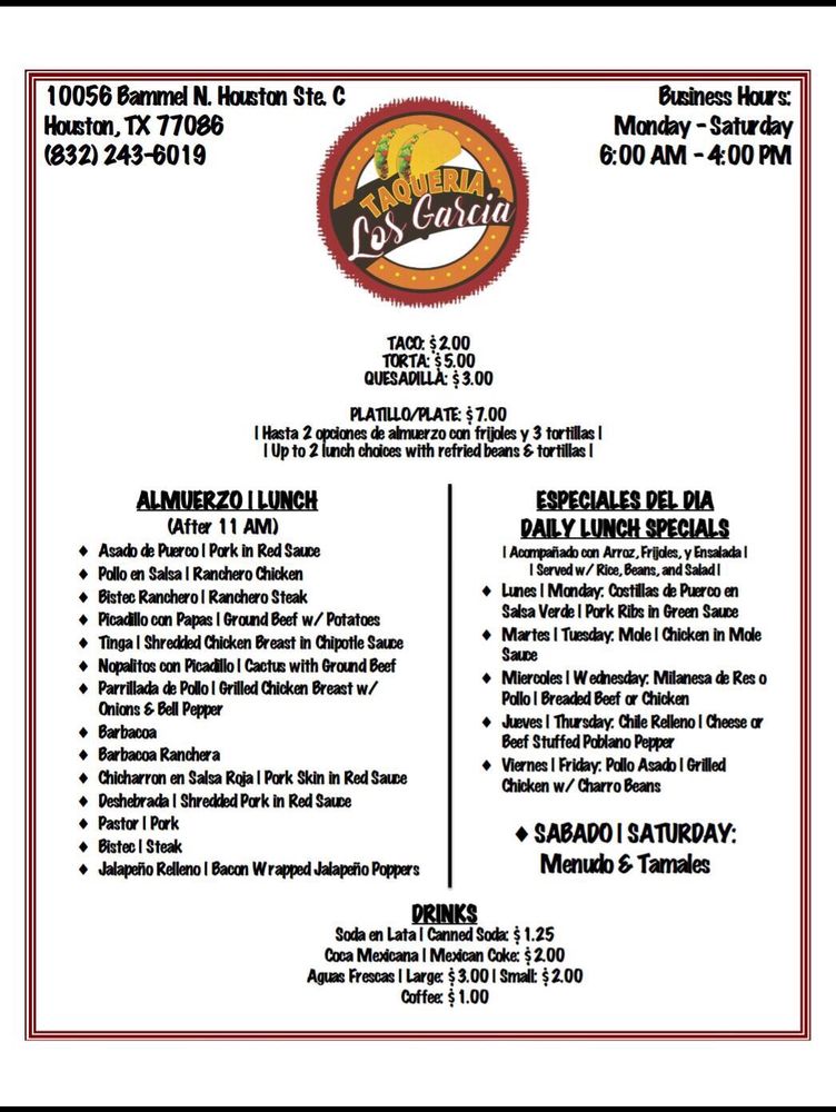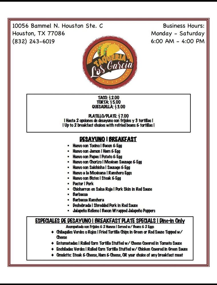 Introducing the menu at Taqueria Los Garcia, a vibrant spot in Houston that's redefining breakfast and brunch with authentic Mexican flavors. Known for its cozy, quiet atmosphere, this taqueria is perfect for families and groups. The menu features a stellar array of options, including their famed breakfast tacos starting at just $2. With hearty servings of barbacoa and homemade tortillas, it's no wonder customers rave about the incredible taste. Don’t miss the Almuerzo lunch platillo, offering tantalizing choices like Asada De Puerco and Pollo En Salsa for only $7.